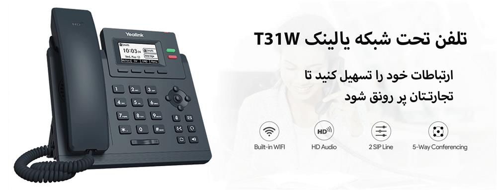 تلفن تحت شبکه Yealink SIP-T31W محصول جدید شرکت یالینک به عنوان یک تلفن sip phone بسیار شیک با عملکرد قوی، امکانات قابل قبول، قابلیت پشیبانی از 2 اکانت، صدای HD و مجهز به سیستم وای فای یک گوشی تحت شبکه ایده آل، برای استفاده در دفاتر و شرکت ها می باشد. این تلفن تحت شبکه برای مشاغل کوچک و متوسط طراحی شده و جایگزین و بروز شده مدل قدیمی T31P می باشد. سری T3x تلفن های رومیزی تحت شبکه یالینک راه حلی کم خطر، کم هزینه و با تکنولوژی بالا برای هر شرکتی است که مایل به مدرن سازی و ارتقای شبکه تلفنی دفاتر خود هستند.